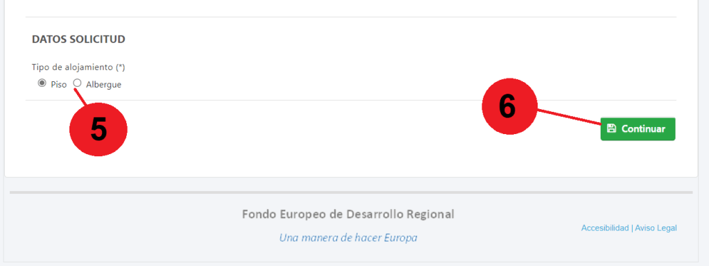 El sistema comprobará que esta misma persona ya no esté en otra solicitud desde otra entidad lo cual le indicara. También comprobará si en el momento de la solicitud la persona ya está en otro centro residiendo, lo que no impedirá que curse su solicitud aunque le indicará el centro donde reside. Por último el formulario le pedirá que aclare la petición, si consiste en PISOS o Albergues (5). Completado este bloque pulsaremos CONTINUAR (6).