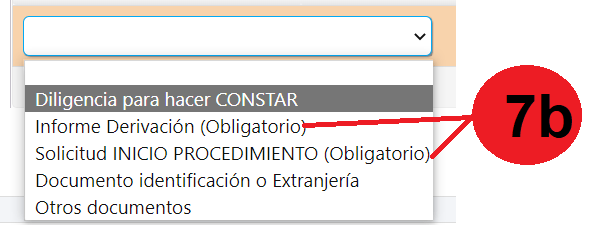 Al pulsar nuevo le desplegará una línea donde usted tendrá que indicar que tipo de documento que presentará. Para ello al pulsar sobre este campo se desplegará los diversos documentos que se permiten (7), como por ejemplo Solicitud, informe de derivación según permita el procedimiento. Los tipos de documentos permitidos son: