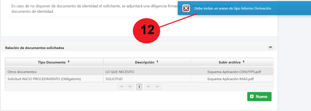 Es importante que adjunte obligatoriamente los documentos que están marcados como obligatorios de no ser así, el sistema no le dejará continuar con la presentación mostrándole el siguiente mensaje (12).