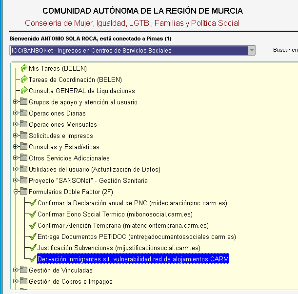 Solo estará visible para aquellos profesionales de las entidades del Tercer Sector que están autorizados a ello, por estar adscritos al contrato de prestación de servicios suscrito entre la Consejería de Política Social, Familias e Igualdad y distintas entidades del Tercer Sector.