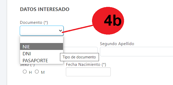 Acabado este bloque de datos le solicitará el bloque de datos correspondiente a la persona vulnerable. Le solicitará que indique el tipo de Documento, siendo los permitidos NIE, DNI y pasaporte (4b). (Podrá introducir como pasaporte cualquier otro indicador del que disponga en caso de no disponer de la documentación).