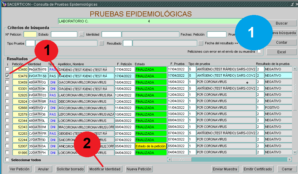 (1) Con el ratón marcando el check de seleccionar marcaremos sobre el paciente que deseamos modificar sus datos de las pruebas que tenemos introducidas, estén en la fase de PENDIENTE, CITADO o FINALIZADA.