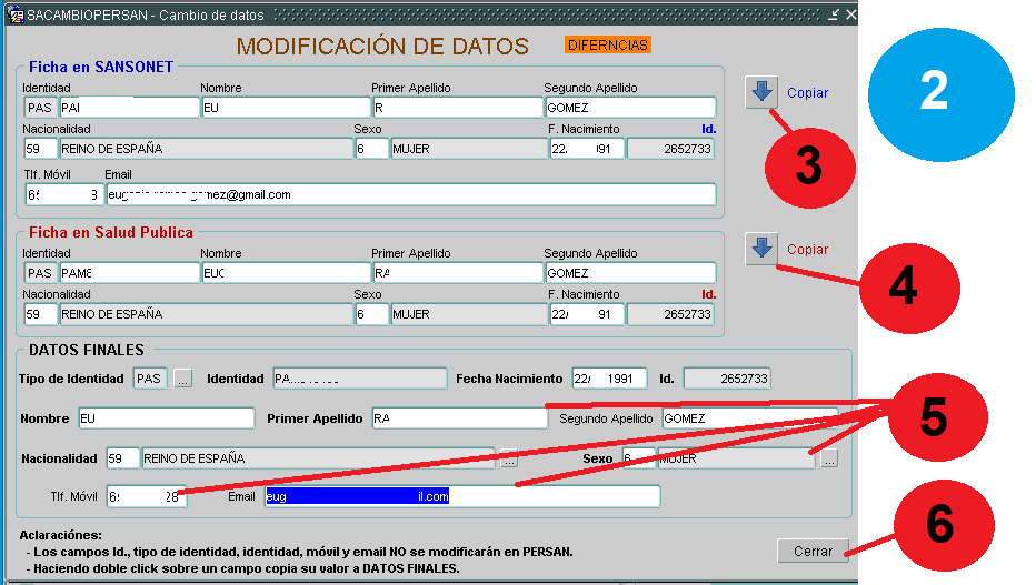 El sistema nos muestra tres bloques de datos. El primero (3) nos muestra con que datos estás inscrito ese paciente en el sistema SANSONET.