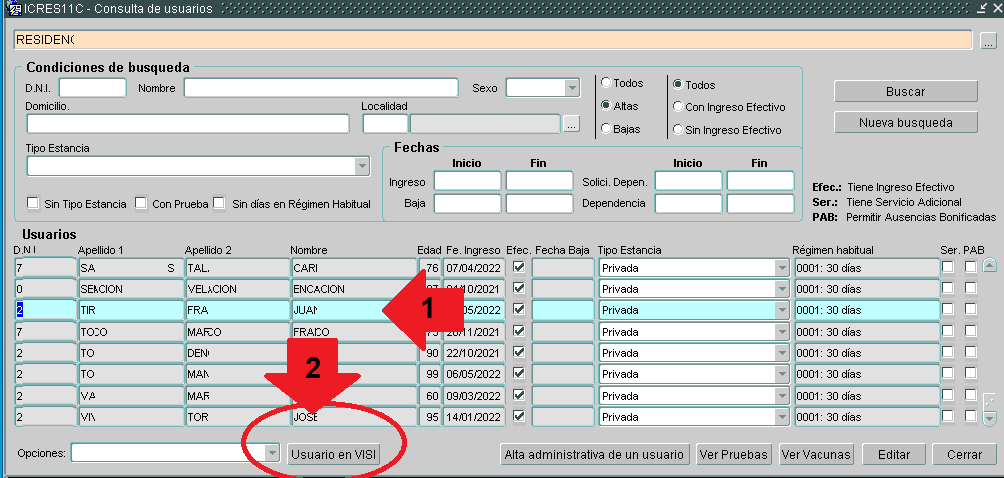 Para ello nos situaremos en el formulario de USUARIOS DEL CENTRO (donde damos las altas de los usuarios), nos situaremos encima del usuario/residente deseado (1) y pulsaremos el botón Usuario en VISI (2).