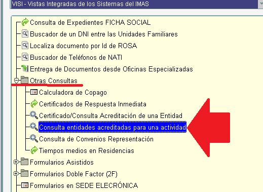Podemos ver todos los centros y entidades acreditadas para una determinada actividad, para ello encontraremos en nuestro menú de SUSI y VISI, una opción de «Consulta entidades acreditadas para una actividad«.