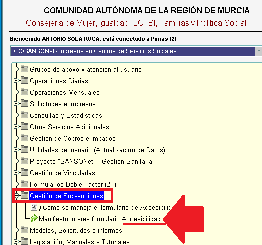 Las personas autorizadas al acceso a ICC/SANSONET que pertenezcan a la entidades jurídicas invitadas a manifestar su interés de participación en la subvenciones de accesibilidad tendrán su menú de ICC/SANSONET las siguientes opciones y permisos: