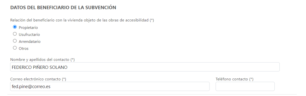 Persona que finalmente se va a beneficiar de las actuaciones y subvenciones. Debe ser una persona física. Indicaremos su nombre y dos apellidos, en correo electrónico que tiene y teléfono (ambos datos obligatorios). Debemos indicar obligatoriamente que tipo de relación propietaria une a nuestro beneficiario con vivienda física donde se va a realizar la actuación:
