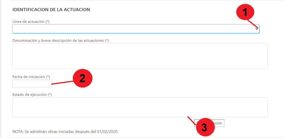 (2). Fecha de Inicio: indicaremos la fecha en que iniciaron las obras o tenemos prevista iniciarlas, siempre deben ser mayores al 01/02/2020.