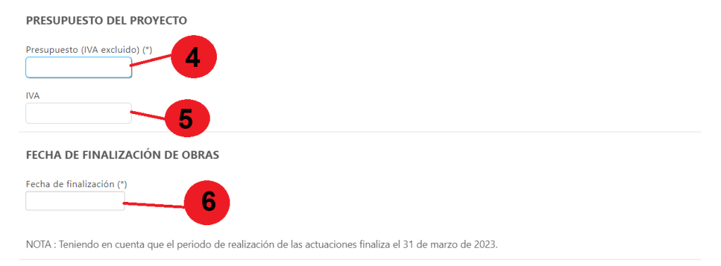 (6). Fecha finalización de la obra: dato obligatorio. Fecha prevista de conclusión de la obra, debe ser inferior al 31/03/2023.