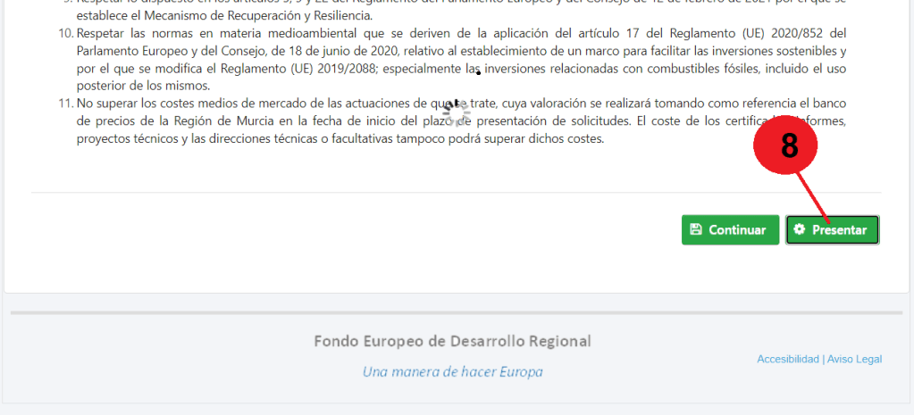 Pulsaremos el botón de PRESENTAR (8) para continuar con la presentación. Una vez pulsado este botón entraremos en el bloque común de todos los formularios electrónicos de la CARM, donde indicaremos o no, nuestra oposición a los certificados de interoperabilidad, los datos de notificación, el adjunto de documentos requeridos como obligatorios, el adjunto de otros documentos que consideremos de interés, y finalmente su presentación.