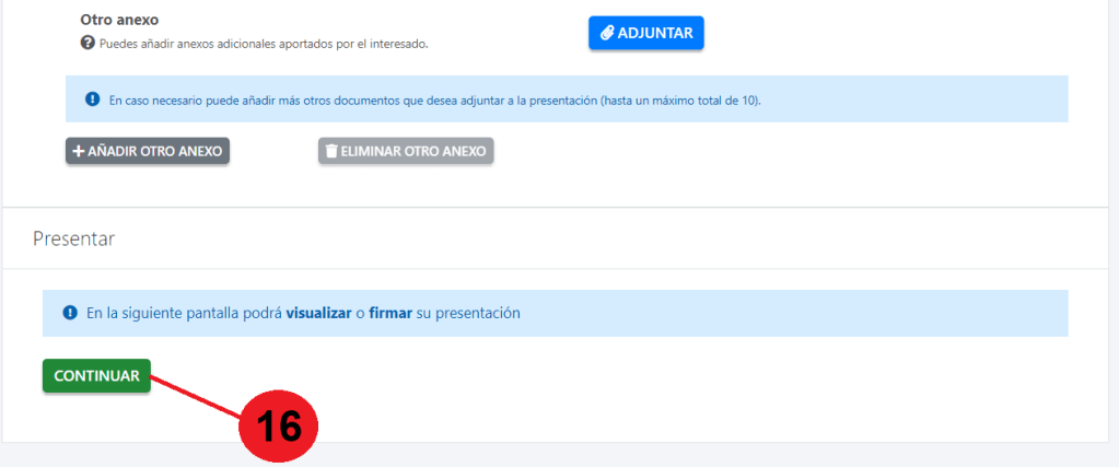 Finalizado el proceso de adjuntar documentos, tendremos abajo un botón destinado a CONTINUAR (16) con el proceso de finalización. Lo pulsaremos para continuar.