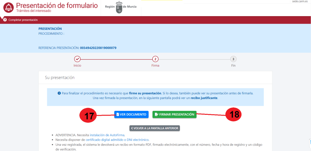 Al pulsarlo nos llevará a la siguiente pantalla donde decidiremos el paso final. Si pulsamos el botón VER DOCUMENTO (17) nos mostrará antes de su presentación como quedará el documento final que vamos a presentar. De pulsar el botón de FIRMAR Y PRESENTAR (18), el sistema reclamará el certificado electrónico y realizará la presentación.