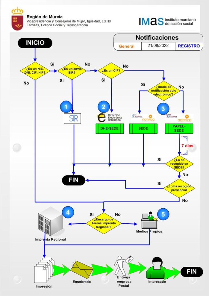 Aquellos otros departamentos que no tienen un Encargo de Tareas con el BORM, tendrán que realizar todo el proceso de impresión, ensobrado y entrega a correos con su propios medios o personal. Lo harán solo para personas físicas que no hayan escogido la opción de modo electrónico, bajo ninguna circunstancia se le enviará a Entidades Jurídicas ni otras administraciones.
