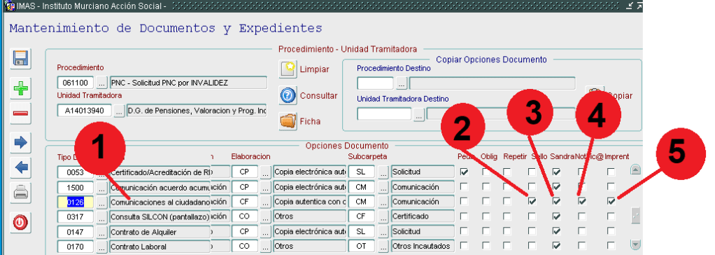 En este caso, para el procedimiento 061100 (Solicitudes de PNC de invalidez y jubilación) hemos definido un documento tipo «Comunicación al interesado» (1). A este documento le hemos dicho que no será firmado por portafirmas, sino sellado mediante sello de organismo DUMAS(2), que será almacenado en SANDRA(3), que será Notificado (4) y que será enviado a IMPRENTA (5).