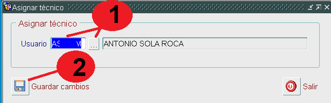 Indicaremos el login del profesional o buscaremos entre la lista de profesionales asignados a ese equipo con el botón de selección marcado con tres puntos (1), una vez escogido el profesional pulsaremos el botón de guardar cambios (2).