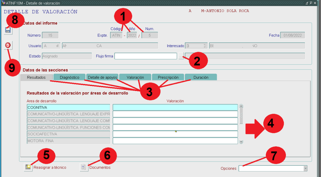 Opciones (7): Barra de posibles acciones a realizar sobre el informe dependiendo de su estado. De estar en situación de ASIGNADO nos permitirá finalizarlo, lo que hará que lo envio a la firma del flujo anteriormente indicado (2) dejando el informe en estado de PENDIENTE DE FIRMA. De encontrarse en PENDIENTE DE FIRMA, no dejará hacer nada hasta que esté no esté firmado.