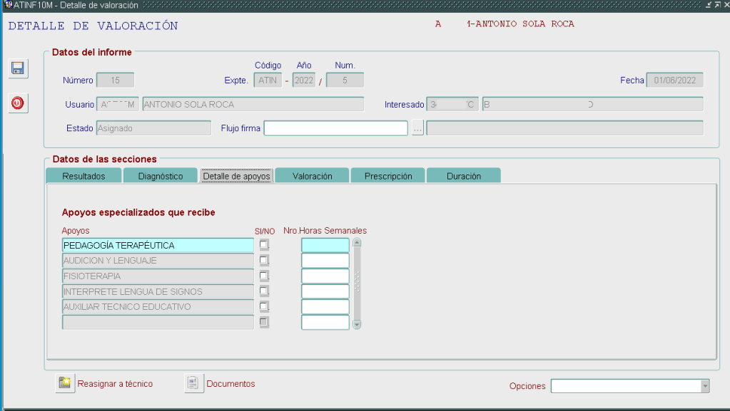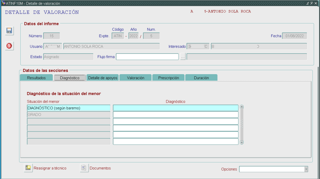Menor interesado (11): muestra el identificado de identidad y nombre del menor interesado en el servicio a valorar. En aquellos menores que no tengan DNI el sistema les asignará uno provisional.