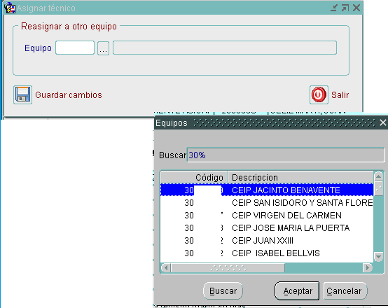 Botón Reasignación de equipos (20): este botón nos abre una ventana elegir el equipo al que reasignar el informe. Asignará este profesional a todos los expedientes que tengamos marchados con un check (7). SOLO VISIBLE PARA EL DIRECTOR DEL EQUIPO.