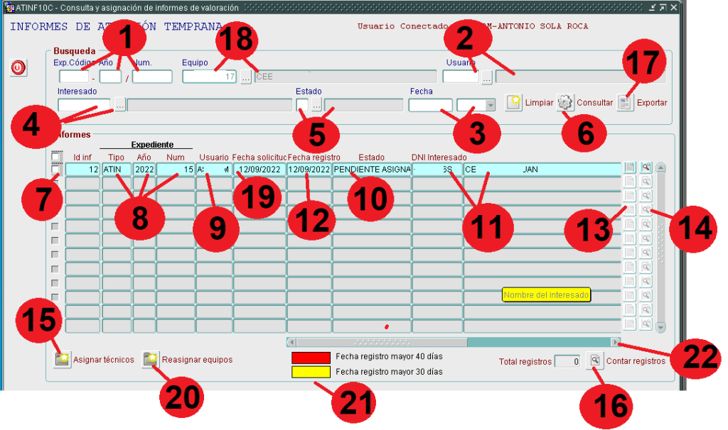 Fecha de Solicitud (12): fecha de la solicitud del interesado para ser valorado. Cuando aparece de color amarillo es que ya han trascurrido 30 días desde la fecha de la Solicitud, en caso de estar rojo significa que ya han trascurrido 40 días desde la fecha de la solicitud. leyenda (21).