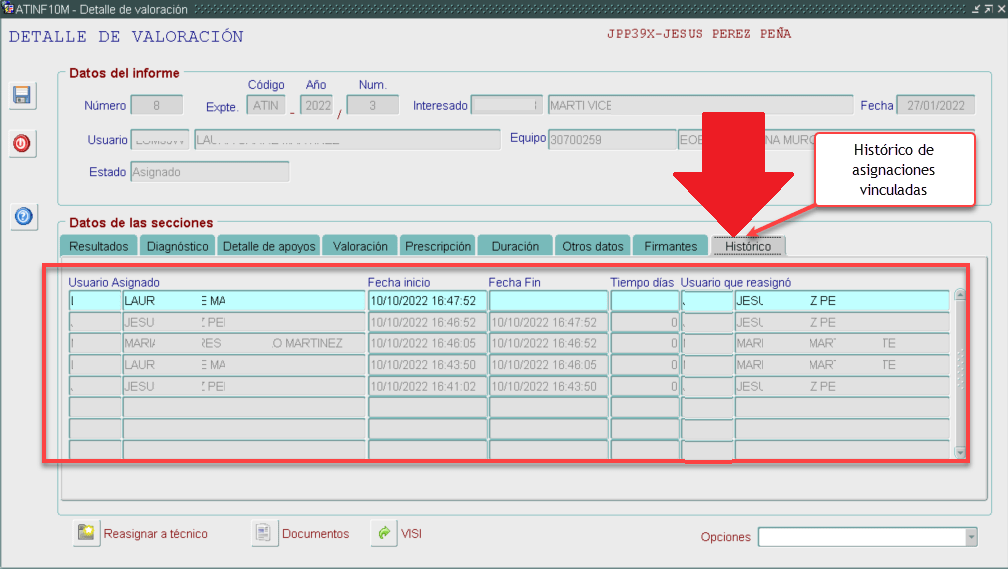 Mediante esta pestaña veremos el histórico por el que ha ido pasando el informe hasta concluirse. Nos indicará quien lo pasó, que día y hora, a quién lo paso, que día y hora.