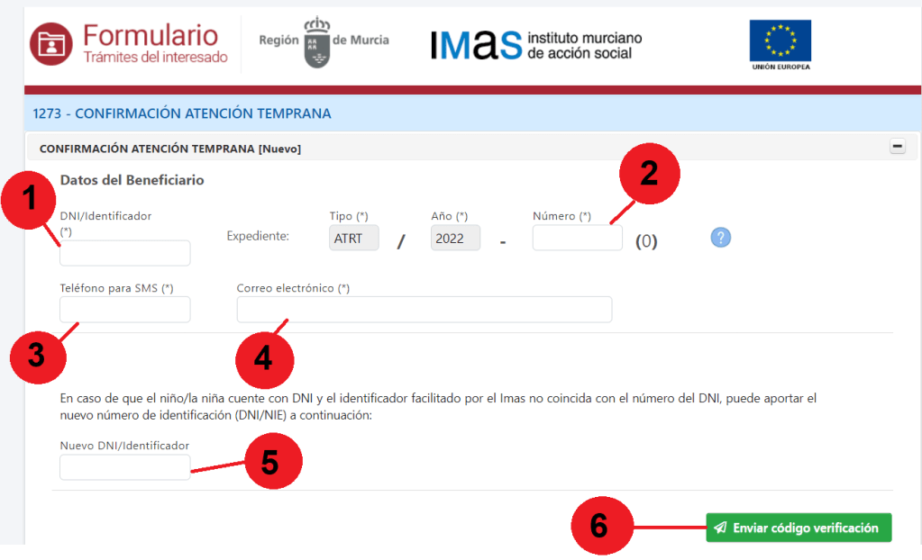 (6) Botón de enviar código activación al pulsarlo enviará un código de verificación mediante SMS al teléfono facilitado, y al correo electrónico facilitado.