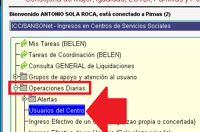 PASO 2. Notificación del Documento. El centro desde su aplicativo ICC/SANSONET, acudirá a la ficha del menor y obtendrá el documento para su entrega a la familia. Para ello en ICC/SANSONET se situará en el menú de OPERACIONES DIARIAS y elegirá la opción de USUARIOS DEL CENTRO.