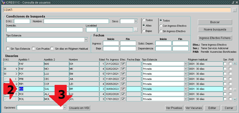 Al pulsar usuarios del centro nos mostrará a todos los niñ@s del centro. Nos situaremos encima del niñ@ deseado (2) y desplegaremos el menú de opciones (3).