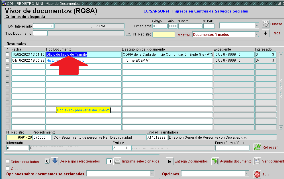 Nos mostrará el visor de documentos ROSA y desde él escogeremos el documento de Oficio de Inicio de Trámite. Al clickear con el ratón dos veces seguidas sobre él, nos abrirá el documento y podremos almacenarlo, enviarlo por correo o imprimirlo.