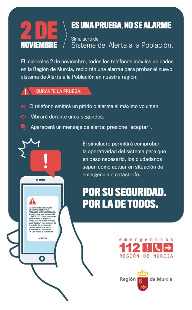 El próximo miércoles 2 de noviembre 2022, entre las 10 y las 11 horas, se va a realizar la primera prueba del nuevo sistema de alerta a la población en caso de emergencia, que la Dirección General de Protección Civil y Emergencias del Ministerio del Interior, desarrollador del sistema, ha programado para la Región de Murcia.