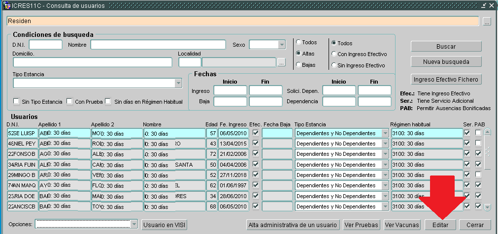 Una vez seleccionamos esta opción, nos aparece la pantalla de usuarios de nuestro centro. Una vez en ella, seleccionaremos al usuario marcándolo o situándonos encima de él. Pulsaremos el botón de editar.