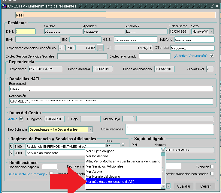 Al pulsar el botón de editar nos sitúa sobre la ficha del usuario. En ella encontraremos el desplegables de opciones. Elegiremos la opción de VER MAS DATOS DEL USUARIO (NATI).