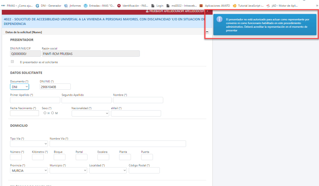 Al introducir los datos del DNI del solicitante, el sistema comprobará si existe un convenio con la entidad. En este caso, al no disponer de un convenio, se deberá de acreditar la representación en el momento de presentar la solicitud.
