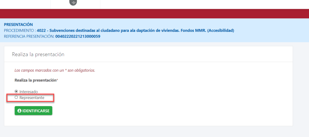 Una vez cumplimentados datos obligatorios de la misma, y pulsado el botón de presentar, el sistema solicitará acreditación. Se deberá de marcar en este caso, la presentación como Representante.