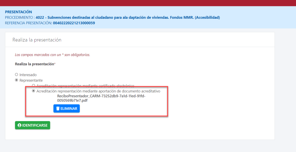 Al hacer click en el botón de IDENTIFICARSE, el proceso de presentación se realizará de la misma forma habitual al resto de presentaciones de solicitudes CARM.