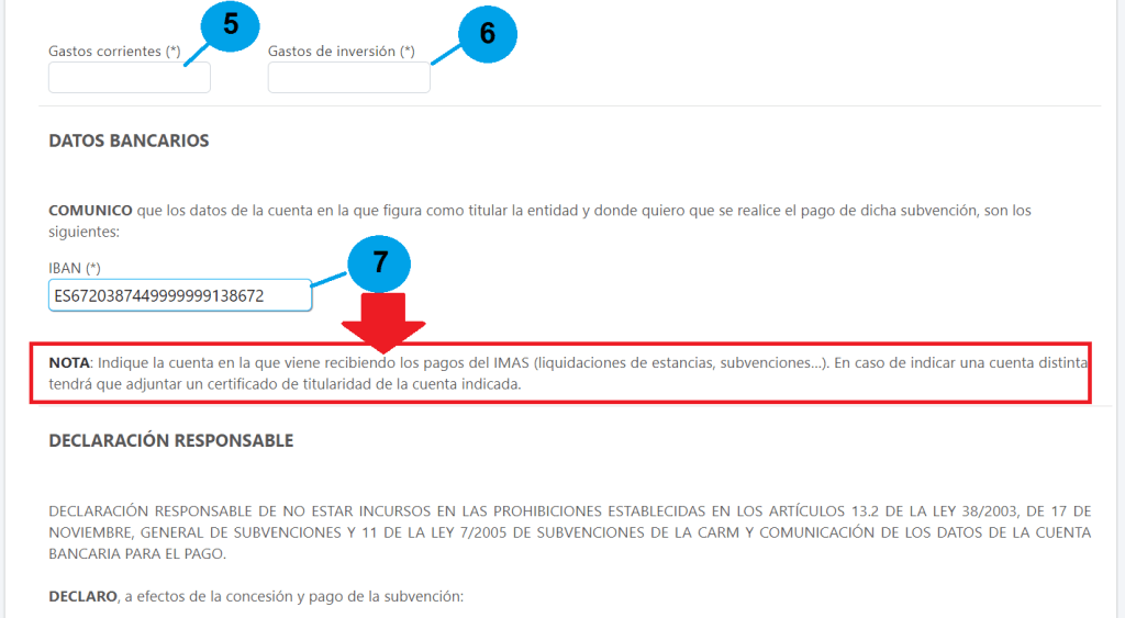 Una vez indicadas la cantidades (solo aparecen si se ha aceptado parcialmente, en caso de aceptar la totalidad no hay que indicar cantidad alguna), el formulario nos solicitará el IBAN (7). El sistema comprobará que dicho IBAN sea correcto, de no serlo se lo indicará y no le dejará completar la presentación hasta que no indique un IBAN correcto.