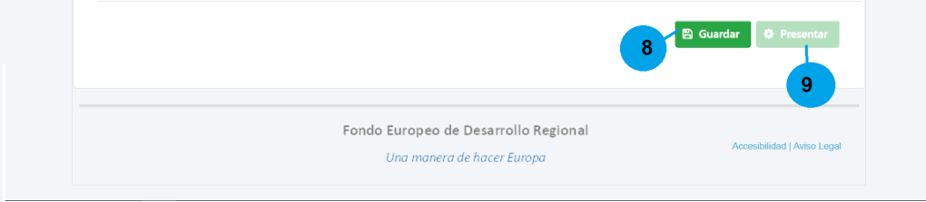 Finalmente el formulario nos mostrará dos botones uno activo GUARDAR (8) y otro no activo PRESENTAR (9). Para que se nos active el segundo (Presentar) es necesario primero pulsar el botón de Guardar (8), una vez el formulario compruebe que todos los datos son correctos, se le activará el botón de PRESENTAR. Pulsaremos el botón de presentar para llegar hasta el sistema común de presentador de la CARM.