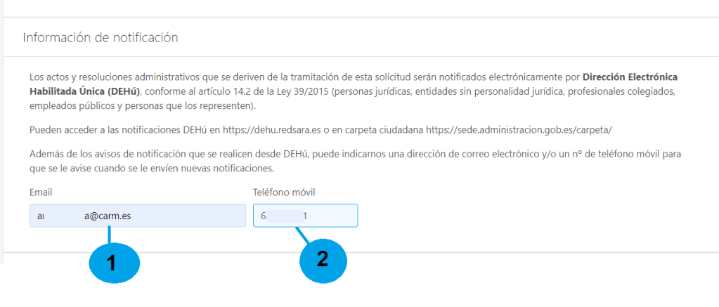 Seguidamente nos solicitará el email y el teléfono donde notificaremos en DHE única a la entidad. Introduciremos un email (1) y un teléfono (2).