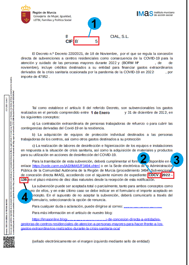 1. Las entidades locales y privadas beneficiarias de la concesión directa recibirán por SEDE ELECTRÓNICA (Sujetos obligados), una comunicación de la correspondiente Dirección General donde le indica los importes propuestos y el código de su expediente de referencia de concesión, Este código comenzará por CDCV.