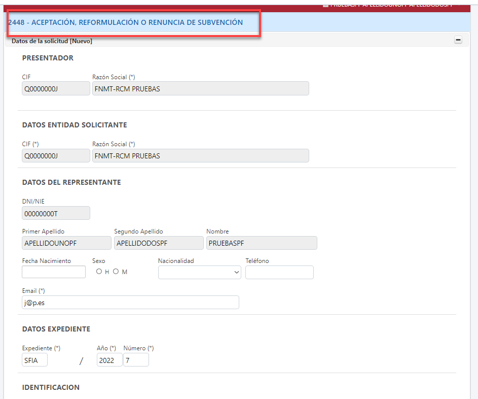 En el formulario se indicará, entre otros, el expediente, año y número que podrá encontrar en la propuesta de concesión y denegación citada (ejemplo SFIA/2022-9: expediente SFIA, año 2022, número 9). Una vez introducidos, aparecerán los datos identificativos del proyecto con, en su caso, el importe propuesto como concesión. A continuación deberá señalar si acepta, reformula o renuncia incorporando los anexos correspondientes.
