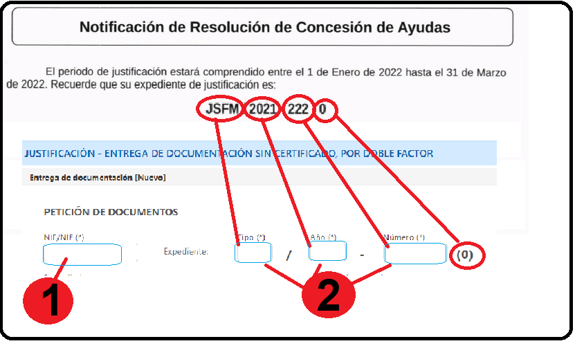 El formulario le mostrará el NIE/CIF (1) de la entidad jurídica interesada beneficiario de la Subvención, y le solicitará el el tipo de expediente, año de expediente y número del expediente de justificación (2) que se le indica en la comunicación recibida.