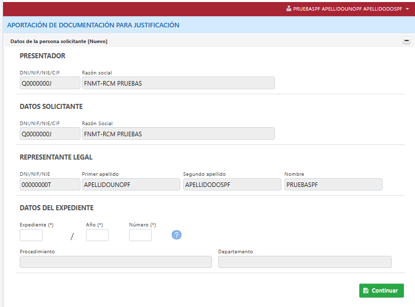 Una vez introducida, de corresponderse el NIE/CIF de la entidad, con el código de expediente, le mostrará el código del procedimiento al que pertenece ese expediente y el departamento gestor (3). Pulsaremos CONTINUAR (4) para seguir al bloque de entrega de justificantes. De no corresponder el NIE/CIF de la entidad con el expediente indicado, nos lo indicará en cuadro mensaje de texto azul en nuestro margen superior derecho, y como es lógico no podremos continuar hasta que ambos valores correspondan.