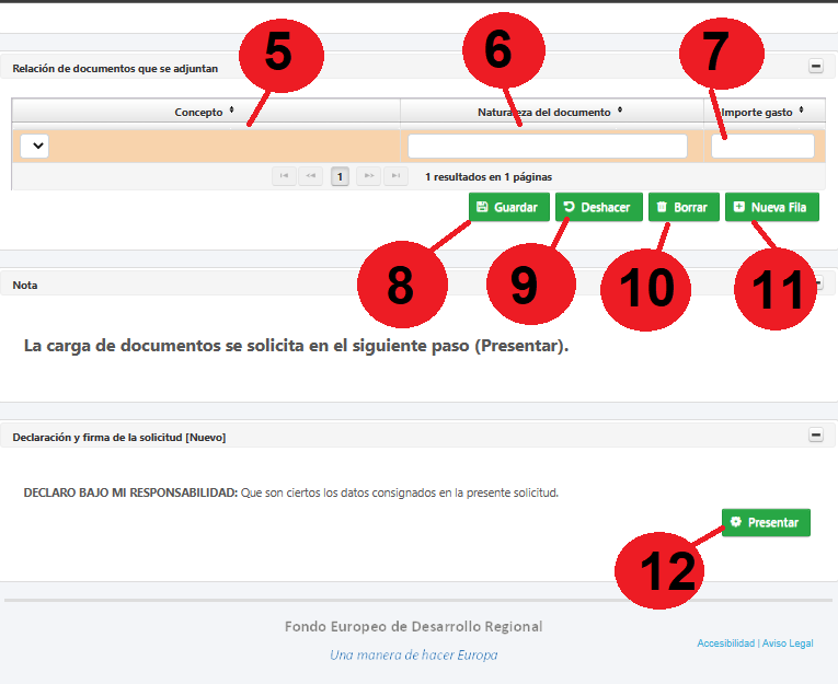 Pulsaremos el botón GUARDAR (8) para dejar grabada esta línea. De haberla grabado y deseamos eliminarla nos pondremos encima de ella y pulsaremos DESHACER (9). Con la tecla BORRAR (10) borraremos todo lo introducido. Finalmente nos mostrará las documentos que llevamos incorporados como justificación, pudiendo añadir nuevos documentos con el botón de NUEVA FILA (11), o eliminando aquellos incorrectos.