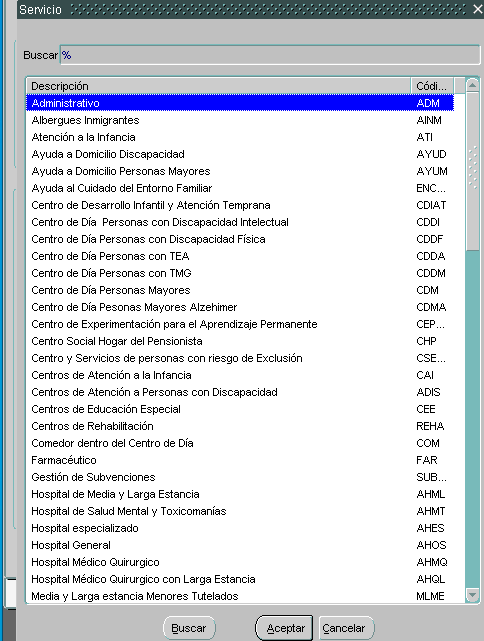(3) SERVICIO. Nos permite acortar los centros que presten un determinado servicio. En blanco por defecto todos. Los servicios que puede seleccionar se le desplegarán mediante el botón de selección.