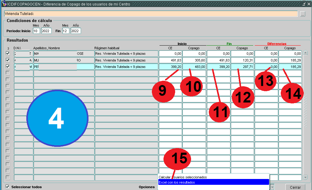 Como consecuencia del paso anterior el sistema irá usuario por usuario seleccionado realizando las formulas de copago aplicadas para ese periodo con arreglo a la capacidad económica.