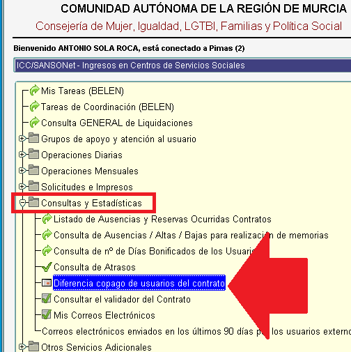 Para ello seguiremos elegiremos la opción de DIFERNECIAS DE COPAGO USUARIO DEL CONTRATO, en nuestro menú de ICC/SANSONET, dentro de la opción de CONSULTA Y ESTADISTICAS: