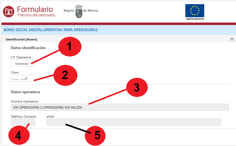 3. OPERADORA: De ser correctos el CIF y la clave facilitada el sistema le mostrará el nombre de la operadora registrada, (4) TELÉFONO: de contacto de la operadora. (5) EMAIL: correo facilitado por la operadora para la gestión económica del bono, puede ser distinta de la facilitada para la gestión del bono.