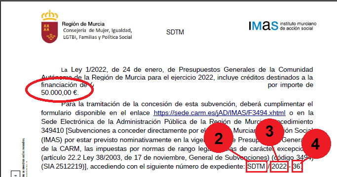 Las entidades beneficiarias de una subvención nominativa recibirán por SEDE ELECTRÓNICA (Sujetos obligados), una comunicación de la Dirección General correspondiente donde le indica el código de su expediente de referencia de concesión, este código variará dependiendo de la entidad emisora o la naturaleza de la subvención. Generalmente este expediente responde a una referencia formada por tres bloques: tipo de expediente, año y número. Ejemplos: