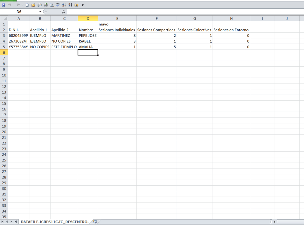 2. Detallaré a todos los niños/niñas indicando el número de sesiones realizadas a lo largo de ese mes en cada uno de los tipos en los que participó (individual, compartida, colectiva o en el entorno). En estas sesiones pondré las que asistió como aquellas otras en las que no asistió por motivo imputables al interesado y no al servicio del centro.