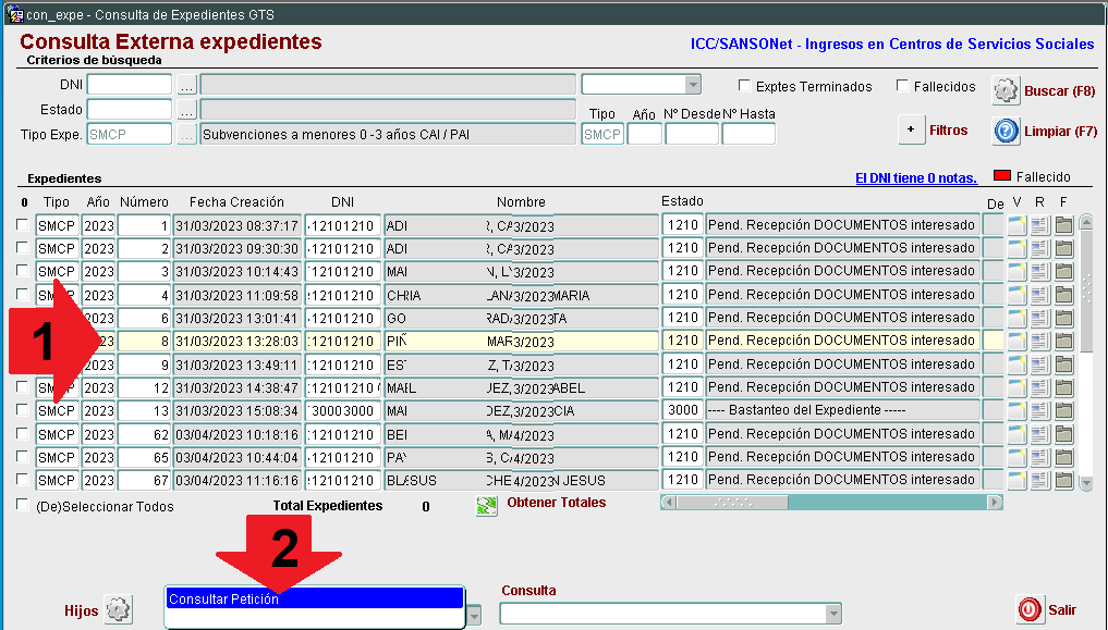 Para ello desde nuestra gestión externa de expedientes y situados sobre el expediente de nuestro usuario/representado (1), pulsaremos la opción de CONSULTA PETICION (2).