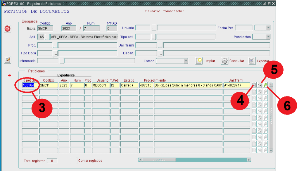 Una vez pulsada esta opción, el sistema nos mostrará todas las peticiones de documentos realizadas mediante petidoc, con la finalidad de que podamos consultarlas, para saber que se pidió, si se entregó o incluso entregarlas nosotros mismos.